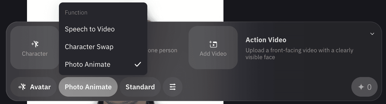 In the Functions panel, choose Photo Animate. This is the tool that brings still photos to life by animating facial expressions and subtle movements.